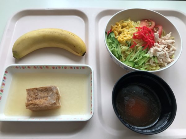 冷やし中華、厚揚げのみぞれ煮、バナナ。