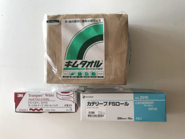 キムタオルをサージカルテープでとめながらパウチを覆い、FSロールでカバーします。