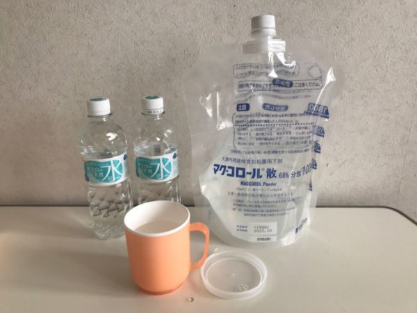 下剤を10分かけて200ml飲み、水を5分かけて100ml飲む。