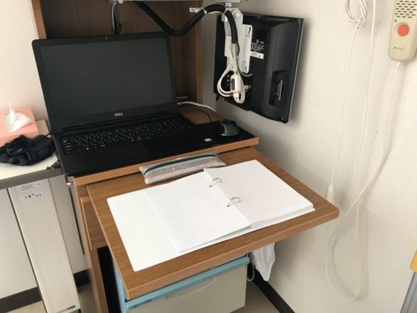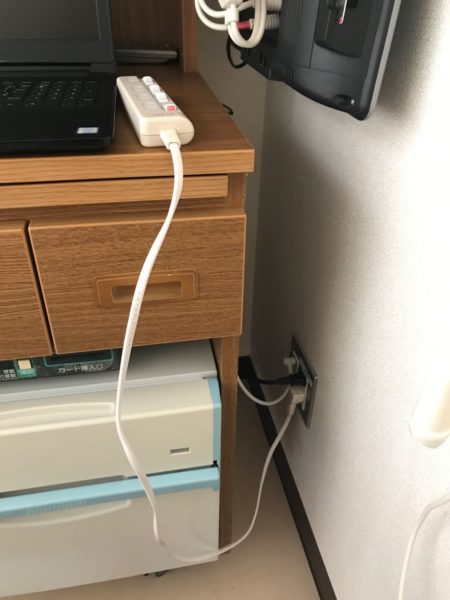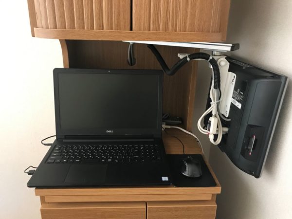 まず床頭台のテレビを除けてわがPCを設置します。