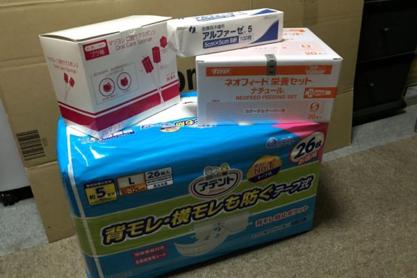 今日の午前中に、補充のために発注していたオムツ、瘻孔ケアのガーゼ、経管栄養のチューブ、口腔ケア用のスポンジが届きました。