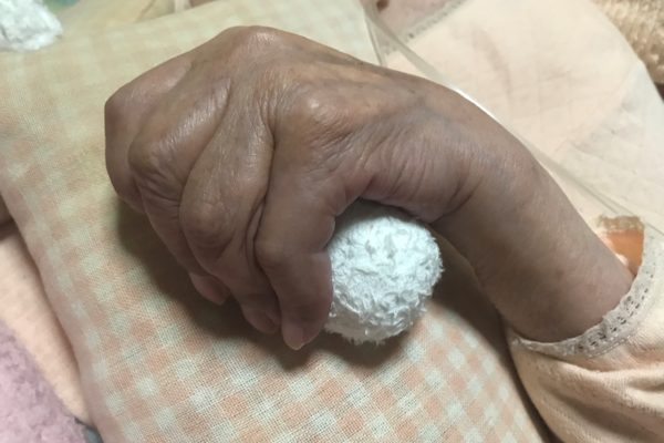手にはタオルで作ったクッションを握らせているのですが、いつもだったら強く握りしめているので取り換えるのも大変なのですが、今は簡単に抜けてしまいます。